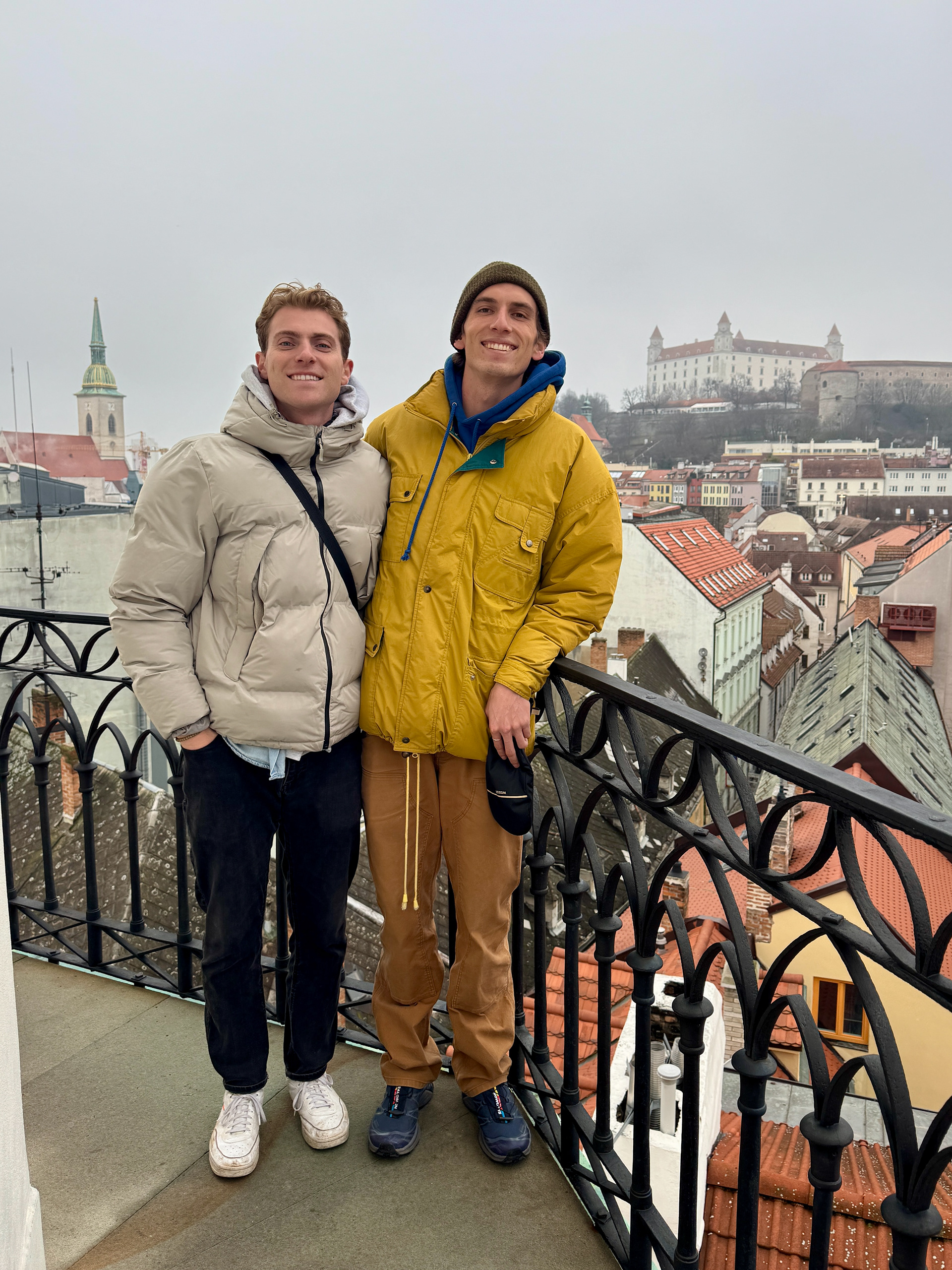The boys are still on a varying schedules. Josh and I are off to Bratislava, Slovakia early, while Jake and Scott still have their day in Vienna. Quick bus into Bratislava. We tried to do some less popular activities today so tomorrow we could finally get in sync. Which was hard, because Bratislava is not a big town. Day trip town really. But Joshie and I had a day, arguable one of my favorites. We found a tower to get a view of the city, which was a epic since it was so foggy. But we did see a random assortment of coins below us on the roof, so of course, we added to the pile. There was a drain pipe that seemed to be the target. Which is interesting because that leads the coin directly into the pathway below where there are hella people, and well, were about 4 stories up. Josh nails the drain pipe and then almost nails a woman walking unexpectedly below. Like real close. I try and miss, but my coin still goes wild, and well, almost hits the crowd below us. Interesting traditions here in Bratislavs.